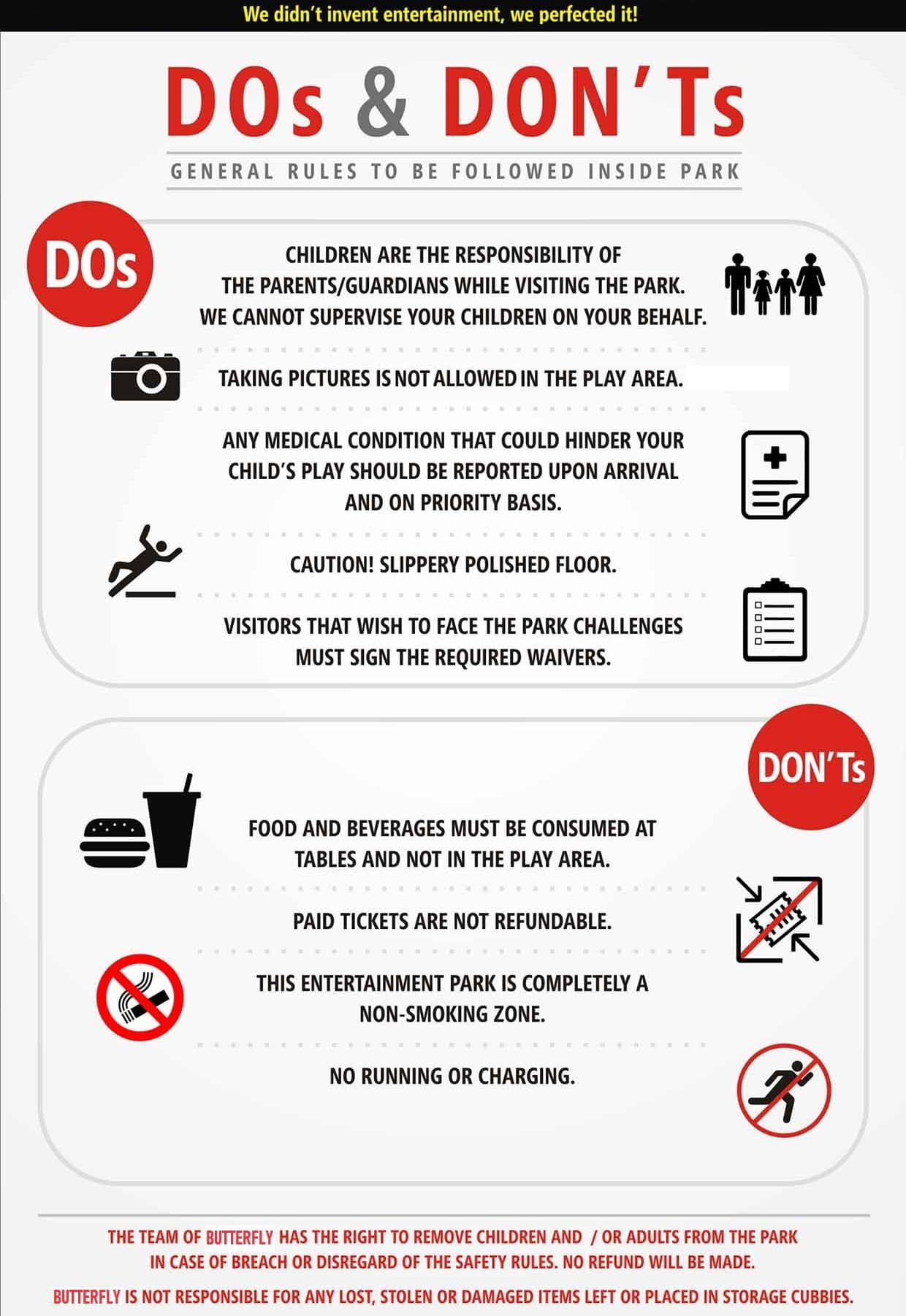 We request all the participants to abide by all the rules, guidelines and instructions given to you by our experts. We would advise you to perform any activity only in the presence of a Butterfly Trampoline Park member.